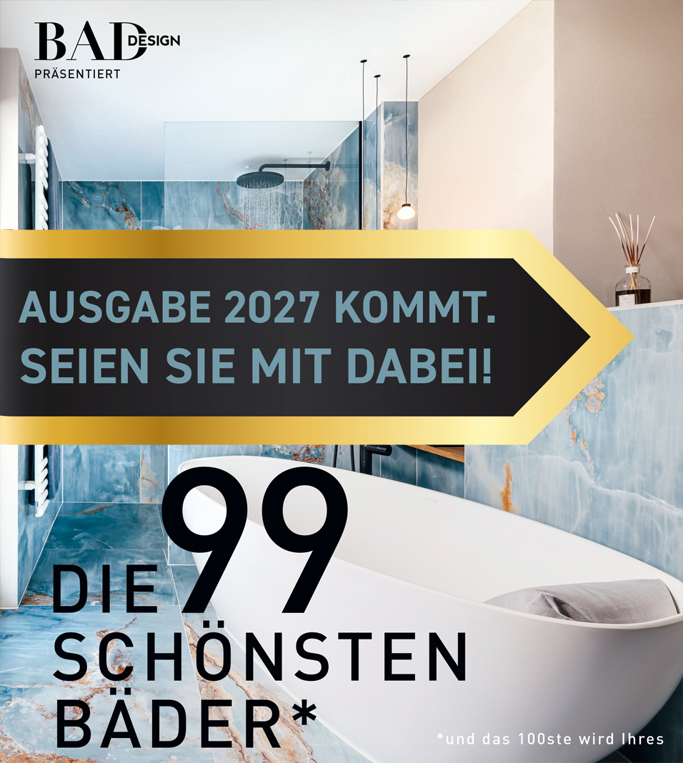 DIE 99 SCHÖNSTEN BÄDER*, das Buch für die Planung von exklusiven privaten Badezimmern, geht bereits in die dritte Runde – für Sie ist ab jetzt die Teilnahme an der Ausgabe 2027 möglich. Das hochwertige Coffee-Table-Book wird der erste Anlaufpunkt für Kunden und Architekten bei der Planung von neuen hochwertigen Bad-Projekten sein.